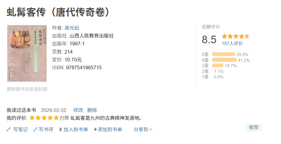 我强烈推荐它认为它值得一读的原因就是这部作品的手法比较高。看似主角是虬髯客,但视角是从李靖展开的,而故事的真正主角实际上是李渊。刘勃的《传奇里的大唐》评价《虬髯客》是一篇媚圣文:看似是写虬髯客,实际上都是在吹李渊英明神武天命所归。从这个视角看,会发现这篇传奇不论是从叙事手法上来看,还是从其政治价值来看,是极为成熟的作品。
