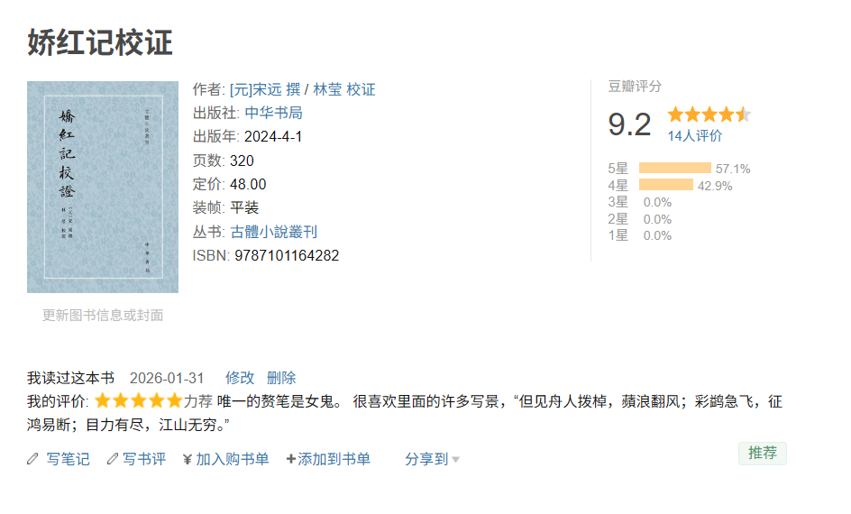 古典文学中“书生大小姐”故事题材的集大成者,可以说这一篇的故事架构把整个才子佳人题材套路都写清楚了。情节上唯一的赘笔是女鬼,除此之外没有任何尿点。值得学习。