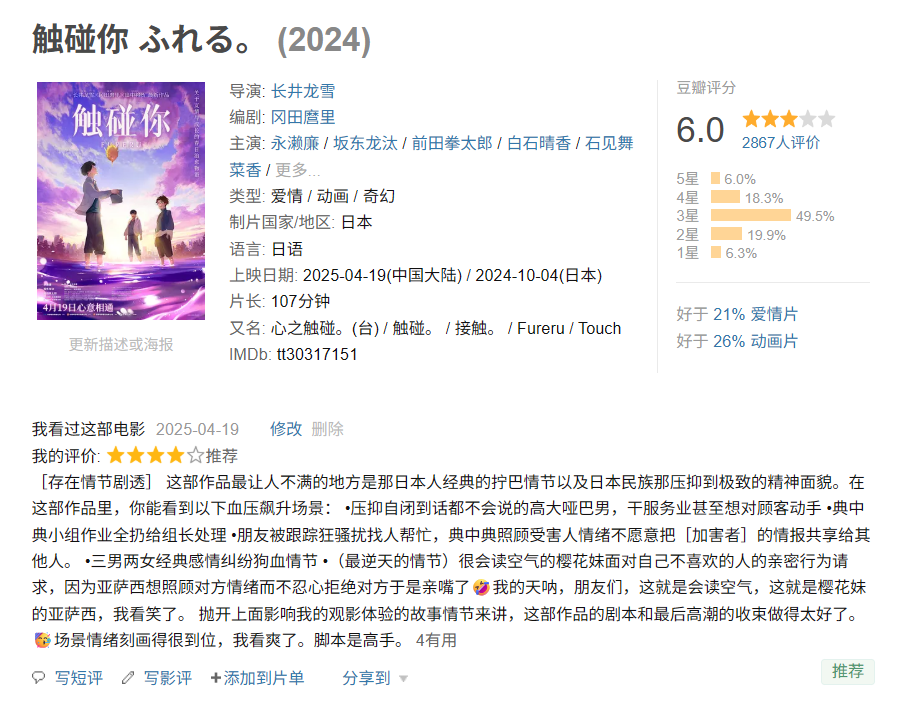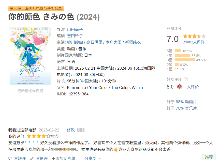 和《你的颜色》一样,我觉得这也是一部被打低了的作品。它也应该能打到 8 分,而不是 6 分。