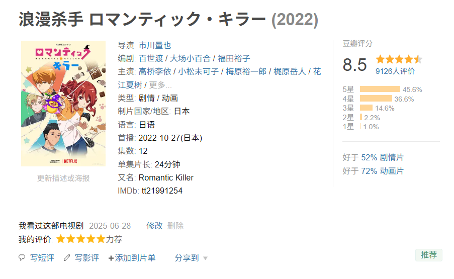 这部作品让人喜欢的是男女主的人设,大女主和大男主应该是让人感觉最舒服的角色设定。当然缺点也比较凸显:还是没逃离日系的那种拧巴味。