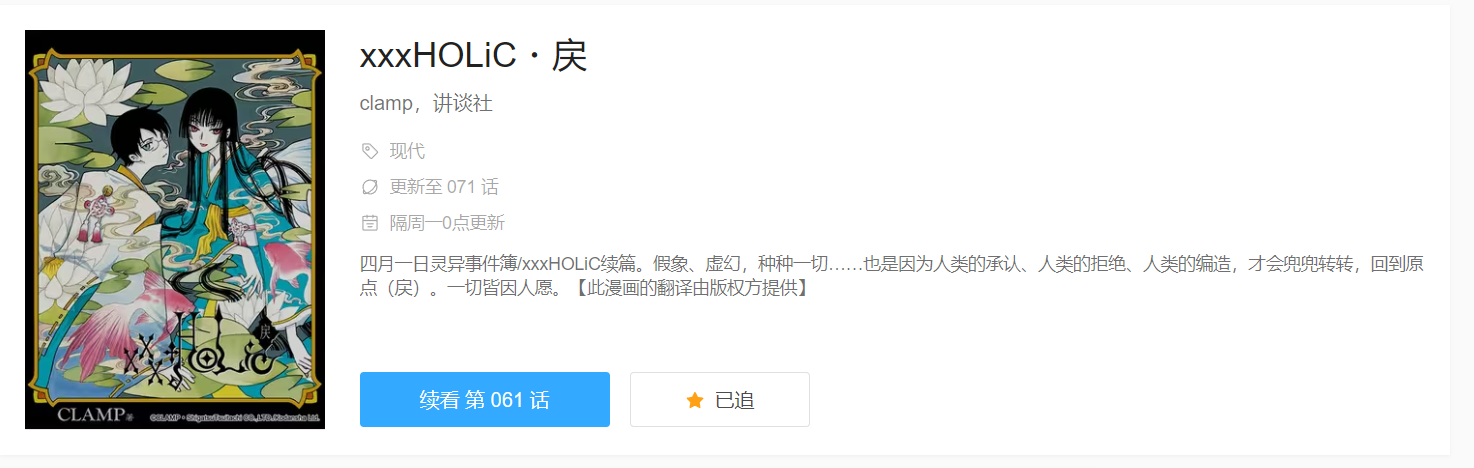 我觉得把她们的作品放到强烈推荐里不需要任何理由。戻(tì)是 xxxHOLic 的续篇。个人建议先去阅读 xxxHOLic 再看这部作品。